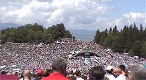 A második napon felsétálunk Csíksomlyóra, a Kis- és Nagy-Somlyó közötti nyeregbe, ahol több százezer zarándok társaságában a Makovecz Imre tervezte színpadon felállított oltárnál részt veszünk a szentmisén.